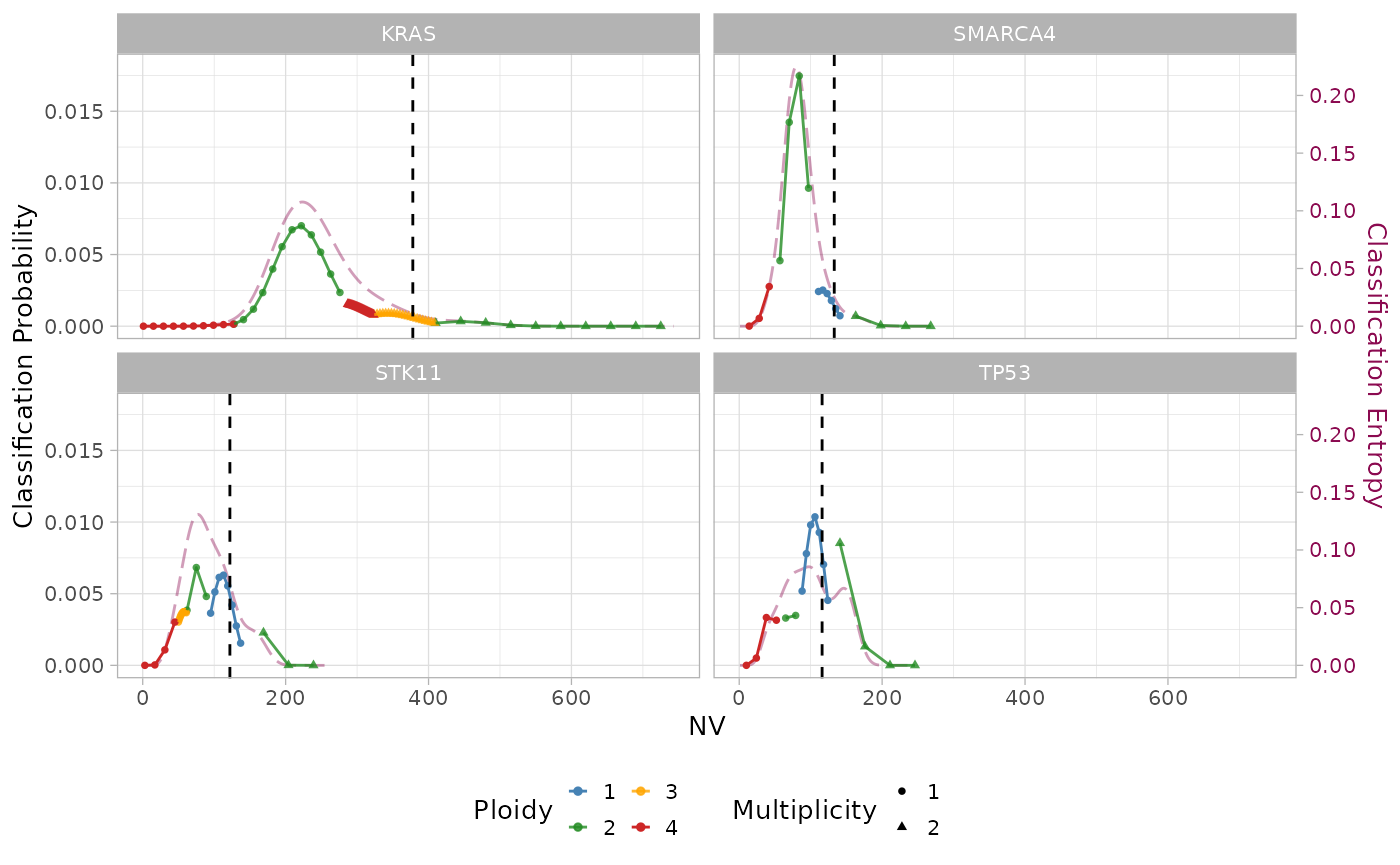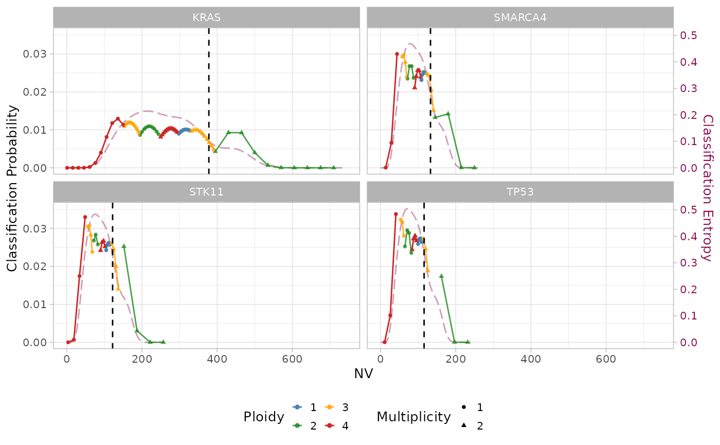 #> intersect, setdiff, setequal, unionIn this vignette, we classify mutations from a single sample from the MSK-MetTropsim dataset provided with the package. We will look at the classification entropy and study the effect of a cut-off on this quantity. In addition, we will see how using the prior obtained from PCAWG whole genomes can help the classification of low quality data.