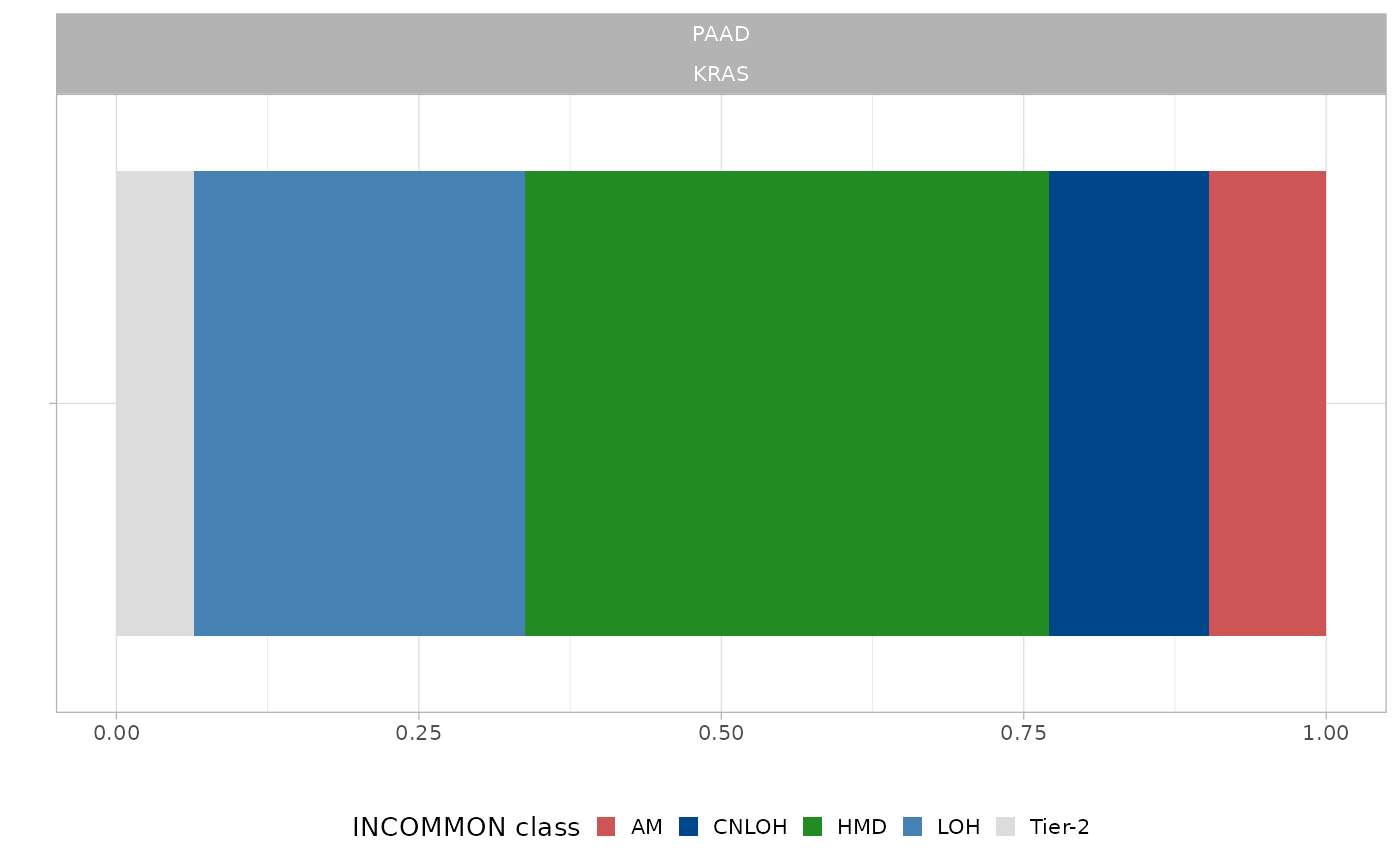 INCOMMON provides a function to aid the interpretation of the mutant genome, downstream of classification. Full inactivation of tumor suppressor genes (TSG) are detected as mutations wiht loss of the wild-type allele, either through pure loss of heterozygosity (LOH) or with copy-neutral LOH (CNLOJ). Enhanced activation of oncogenes are identified as mutations with amplification of the mutant allele. In addition to amplifications in trisomy and tetrasomy (AM), CNLOH events are interpreted for oncogenes as amplifications in disomy, since the mutant allele is found in double copy.