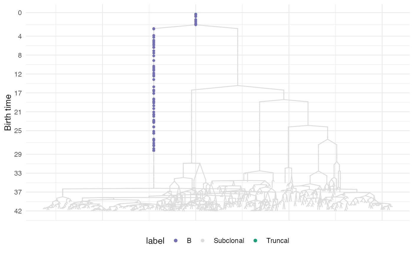 It annotates a plot of cell divisions where branches containing relevant biological events are colored