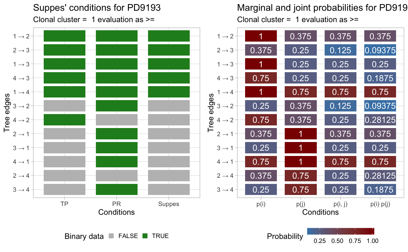 data(mtree_input) x = mtrees( mtree_input$binary_clusters, mtree_input$drivers, mtree_input$samples, mtree_input$patient, mtree_input$sspace.cutoff, mtree_input$n.sampling, mtree_input$store.max )#> [ mtree ~ generate mutation trees for PD9193 ] #> Sampler : 10000 (cutoff), 5000 (sampling), 100 (max store) #> Suppes' conditions : >= #> # A tibble: 4 x 14 #> Misc patientID cluster is.driver is.clonal PD9193d PD9193e PD9193f PD9193g #> <chr> <chr> <chr> <lgl> <lgl> <dbl> <dbl> <dbl> <dbl> #> 1 cuto… PD9193 2 FALSE FALSE 1 1 1 0 #> 2 cuto… PD9193 3 TRUE FALSE 1 0 0 0 #> 3 cuto… PD9193 1 TRUE TRUE 1 1 1 1 #> 4 cuto… PD9193 4 TRUE FALSE 1 0 1 1 #> # … with 5 more variables: PD9193h <dbl>, PD9193i <dbl>, PD9193j <dbl>, #> # PD9193k <dbl>, nMuts <dbl> #> #> ✔ Structures 3 - search is exahustive #> ✔ Trees with non-zero sscore 3 storing 3 #>plot_Suppes(x[[1]])#> Warning: conversion failure on '3 → 4' in 'mbcsToSbcs': dot substituted for <e2>#> Warning: conversion failure on '3 → 4' in 'mbcsToSbcs': dot substituted for <86>#> Warning: conversion failure on '3 → 4' in 'mbcsToSbcs': dot substituted for <92>#> Warning: conversion failure on '2 → 4' in 'mbcsToSbcs': dot substituted for <e2>#> Warning: conversion failure on '2 → 4' in 'mbcsToSbcs': dot substituted for <86>#> Warning: conversion failure on '2 → 4' in 'mbcsToSbcs': dot substituted for <92>#> Warning: conversion failure on '4 → 1' in 'mbcsToSbcs': dot substituted for <e2>#> Warning: conversion failure on '4 → 1' in 'mbcsToSbcs': dot substituted for <86>#> Warning: conversion failure on '4 → 1' in 'mbcsToSbcs': dot substituted for <92>#> Warning: conversion failure on '3 → 1' in 'mbcsToSbcs': dot substituted for <e2>#> Warning: conversion failure on '3 → 1' in 'mbcsToSbcs': dot substituted for <86>#> Warning: conversion failure on '3 → 1' in 'mbcsToSbcs': dot substituted for <92>#> Warning: conversion failure on '2 → 1' in 'mbcsToSbcs': dot substituted for <e2>#> Warning: conversion failure on '2 → 1' in 'mbcsToSbcs': dot substituted for <86>#> Warning: conversion failure on '2 → 1' in 'mbcsToSbcs': dot substituted for <92>#> Warning: conversion failure on '4 → 2' in 'mbcsToSbcs': dot substituted for <e2>#> Warning: conversion failure on '4 → 2' in 'mbcsToSbcs': dot substituted for <86>#> Warning: conversion failure on '4 → 2' in 'mbcsToSbcs': dot substituted for <92>#> Warning: conversion failure on '3 → 2' in 'mbcsToSbcs': dot substituted for <e2>#> Warning: conversion failure on '3 → 2' in 'mbcsToSbcs': dot substituted for <86>#> Warning: conversion failure on '3 → 2' in 'mbcsToSbcs': dot substituted for <92>#> Warning: conversion failure on '1 → 4' in 'mbcsToSbcs': dot substituted for <e2>#> Warning: conversion failure on '1 → 4' in 'mbcsToSbcs': dot substituted for <86>#> Warning: conversion failure on '1 → 4' in 'mbcsToSbcs': dot substituted for <92>#> Warning: conversion failure on '4 → 3' in 'mbcsToSbcs': dot substituted for <e2>#> Warning: conversion failure on '4 → 3' in 'mbcsToSbcs': dot substituted for <86>#> Warning: conversion failure on '4 → 3' in 'mbcsToSbcs': dot substituted for <92>#> Warning: conversion failure on '1 → 3' in 'mbcsToSbcs': dot substituted for <e2>#> Warning: conversion failure on '1 → 3' in 'mbcsToSbcs': dot substituted for <86>#> Warning: conversion failure on '1 → 3' in 'mbcsToSbcs': dot substituted for <92>#> Warning: conversion failure on '2 → 3' in 'mbcsToSbcs': dot substituted for <e2>#> Warning: conversion failure on '2 → 3' in 'mbcsToSbcs': dot substituted for <86>#> Warning: conversion failure on '2 → 3' in 'mbcsToSbcs': dot substituted for <92>#> Warning: conversion failure on '1 → 2' in 'mbcsToSbcs': dot substituted for <e2>#> Warning: conversion failure on '1 → 2' in 'mbcsToSbcs': dot substituted for <86>#> Warning: conversion failure on '1 → 2' in 'mbcsToSbcs': dot substituted for <92>#> Warning: conversion failure on '3 → 4' in 'mbcsToSbcs': dot substituted for <e2>#> Warning: conversion failure on '3 → 4' in 'mbcsToSbcs': dot substituted for <86>#> Warning: conversion failure on '3 → 4' in 'mbcsToSbcs': dot substituted for <92>#> Warning: conversion failure on '2 → 4' in 'mbcsToSbcs': dot substituted for <e2>#> Warning: conversion failure on '2 → 4' in 'mbcsToSbcs': dot substituted for <86>#> Warning: conversion failure on '2 → 4' in 'mbcsToSbcs': dot substituted for <92>#> Warning: conversion failure on '4 → 1' in 'mbcsToSbcs': dot substituted for <e2>#> Warning: conversion failure on '4 → 1' in 'mbcsToSbcs': dot substituted for <86>#> Warning: conversion failure on '4 → 1' in 'mbcsToSbcs': dot substituted for <92>#> Warning: conversion failure on '3 → 1' in 'mbcsToSbcs': dot substituted for <e2>#> Warning: conversion failure on '3 → 1' in 'mbcsToSbcs': dot substituted for <86>#> Warning: conversion failure on '3 → 1' in 'mbcsToSbcs': dot substituted for <92>#> Warning: conversion failure on '2 → 1' in 'mbcsToSbcs': dot substituted for <e2>#> Warning: conversion failure on '2 → 1' in 'mbcsToSbcs': dot substituted for <86>#> Warning: conversion failure on '2 → 1' in 'mbcsToSbcs': dot substituted for <92>#> Warning: conversion failure on '4 → 2' in 'mbcsToSbcs': dot substituted for <e2>#> Warning: conversion failure on '4 → 2' in 'mbcsToSbcs': dot substituted for <86>#> Warning: conversion failure on '4 → 2' in 'mbcsToSbcs': dot substituted for <92>#> Warning: conversion failure on '3 → 2' in 'mbcsToSbcs': dot substituted for <e2>#> Warning: conversion failure on '3 → 2' in 'mbcsToSbcs': dot substituted for <86>#> Warning: conversion failure on '3 → 2' in 'mbcsToSbcs': dot substituted for <92>#> Warning: conversion failure on '1 → 4' in 'mbcsToSbcs': dot substituted for <e2>#> Warning: conversion failure on '1 → 4' in 'mbcsToSbcs': dot substituted for <86>#> Warning: conversion failure on '1 → 4' in 'mbcsToSbcs': dot substituted for <92>#> Warning: conversion